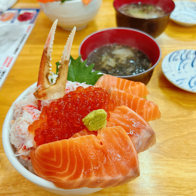 三角市場の中にある「北のどんぶり屋 滝波商店」のわがまま丼で朝ごはん❣️ カニ、いくら、サーモンの組み合わせでいただきました🦀 平日だったので油断してました…🥲8時オープンのところを10分遅れで到着。すでに4組待ちでした…!すごい人気!!! ですが食べて納得しました😌✨並んででも食べたい!贅沢な朝ごはんでした✨✨ #Myことりっぷ #初めての小樽