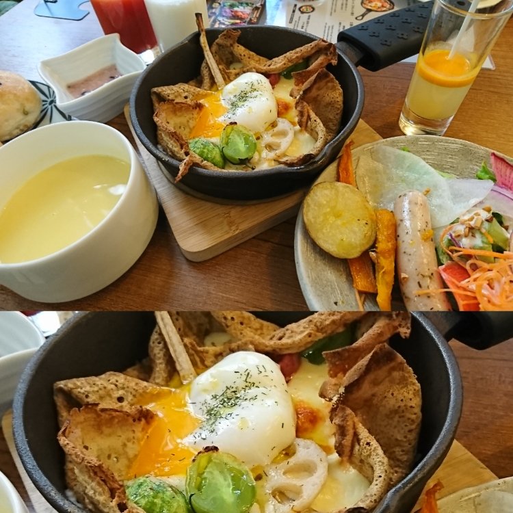 メインが5種類ある中から、大地のガレットスキット焼きを選び、プラスハーフバイキングでサラダ、スープ等を選んで頂きました