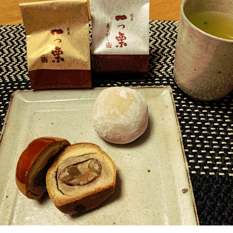 左は「麦こがし」生地にはったい粉を練り込み焼いています。剥き栗丸々一個餡に包まれています。