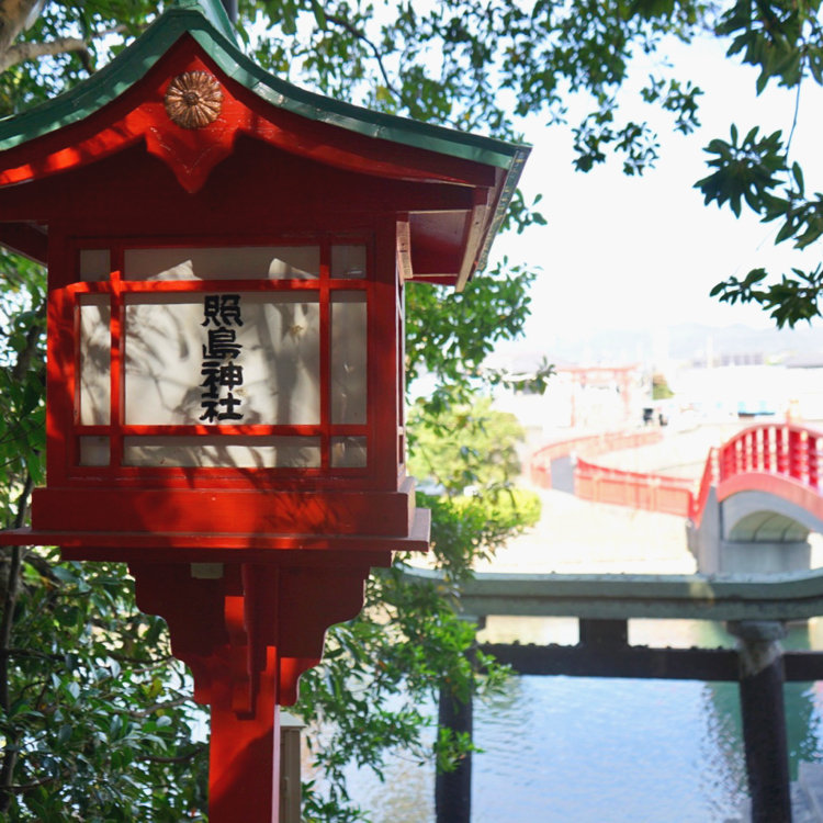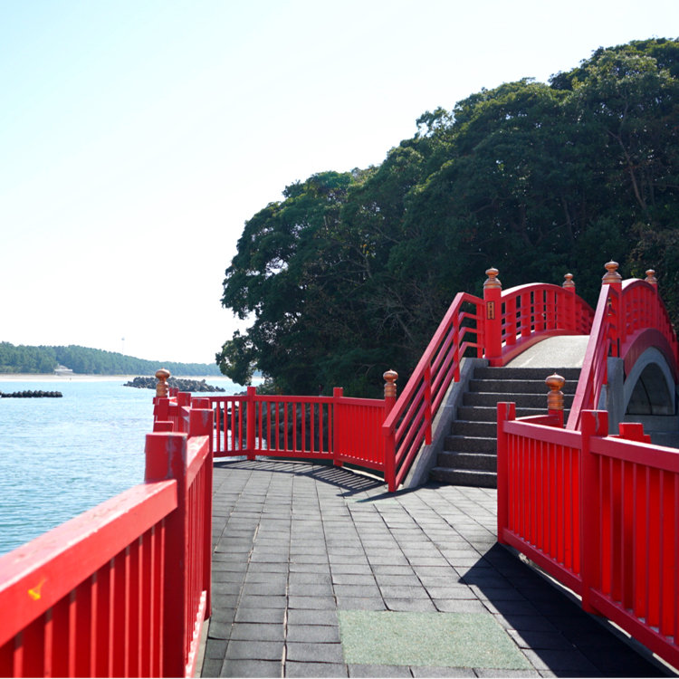 いちき串木野市 照島神社 串木野にある小さな島、照島。 神社と公園があるだけの島は、参道に続く短い橋で陸地とつながっています。 海の上に浮かぶ神社って、なんとなく竜宮城みたいだなぁと思いました。 ・ 朱色が美しい橋のたもとに自転車を停めて、わくわくしながら参道を歩きます。 この辺は海の水も綺麗で、魚もたくさん見えました。