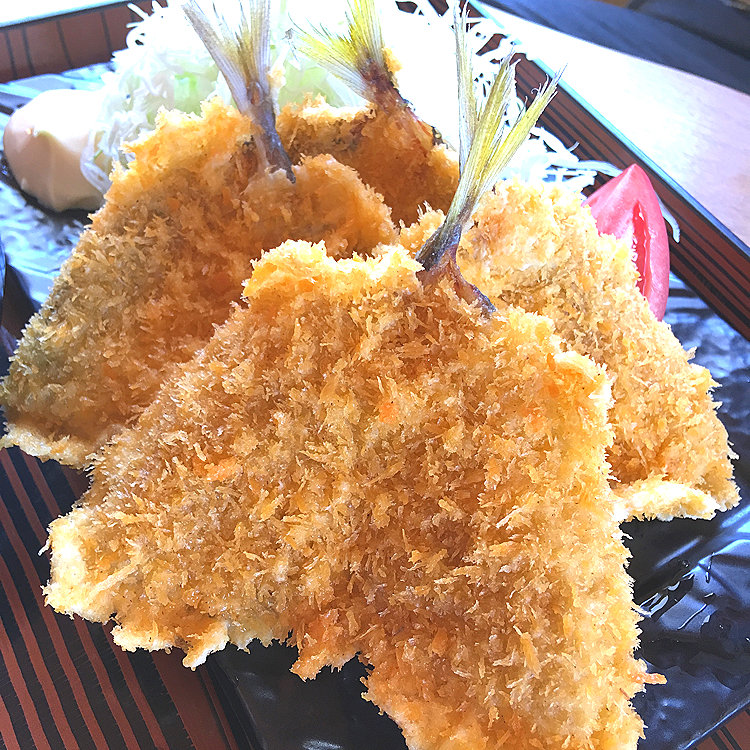 来年ブームの予感?房総の黄金アジフライ。こちらはまるとしさんのアジフライ。とっても甘くて上品な黄金アジフライです!サクサクたくさん食べられちゃいます(^^) ここは冬にはタカアシガニもお刺身定食で出してくれます。わたしのオススメ。