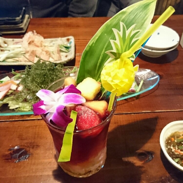 沖縄県恩納村にある居酒屋「海風よ」。 写真はフルーツと赤ワインのサングリアです。 猫のやましろさんと門松がとっても可愛らしくて、来てよかったと思えた素敵なお店でした‼