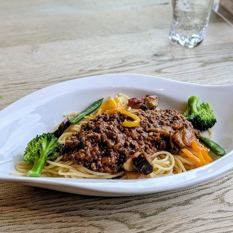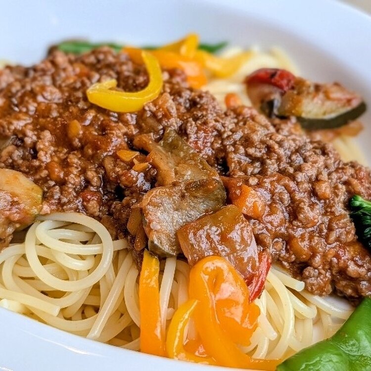 地元愛鷹(あしたか)牛🐂の ミートソースパスタ🍝 マリネパプリカを添えて 愛鷹地区で7軒しか育てられていない貴重なブランド牛🐂のひき肉をたっぷり使用したミートソース。 至福のフルーツパフェ物語さんにて #愛鷹牛のミートソースパスタ #ミートソースパスタ #愛鷹牛 #マリネパプリカ #jun_flat