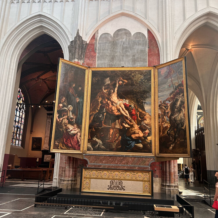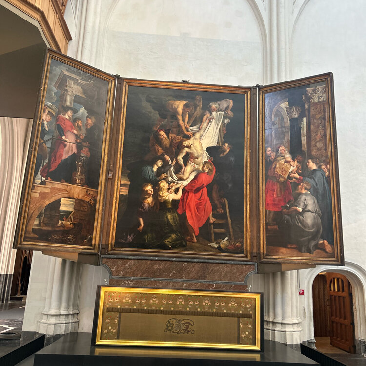 アントワープの大聖堂はとても背の高い立派な建物で、中はまるで美術館のようにたくさんの絵が飾られています。ルーベンスの絵も数枚ありますが、物語に登場するのはこの絵です。教会の中心の祭壇に飾られています。とても大きな美しい絵ですよ😊