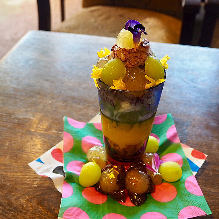 『秘密基地植物園とカフェバー』 ピオーネのパフェ🍇✨ ピオーネ、マスカットと、途中で出てくるカスタードヨーグルトとの組み合わせがさっぱりしてとってもおいしかったです☺︎ ドライフラワーがたくさん飾ってあり、少し不思議な空間で、本当に秘密基地のようなお店です。 #パフェ #ぶどう #京都 #秋深き