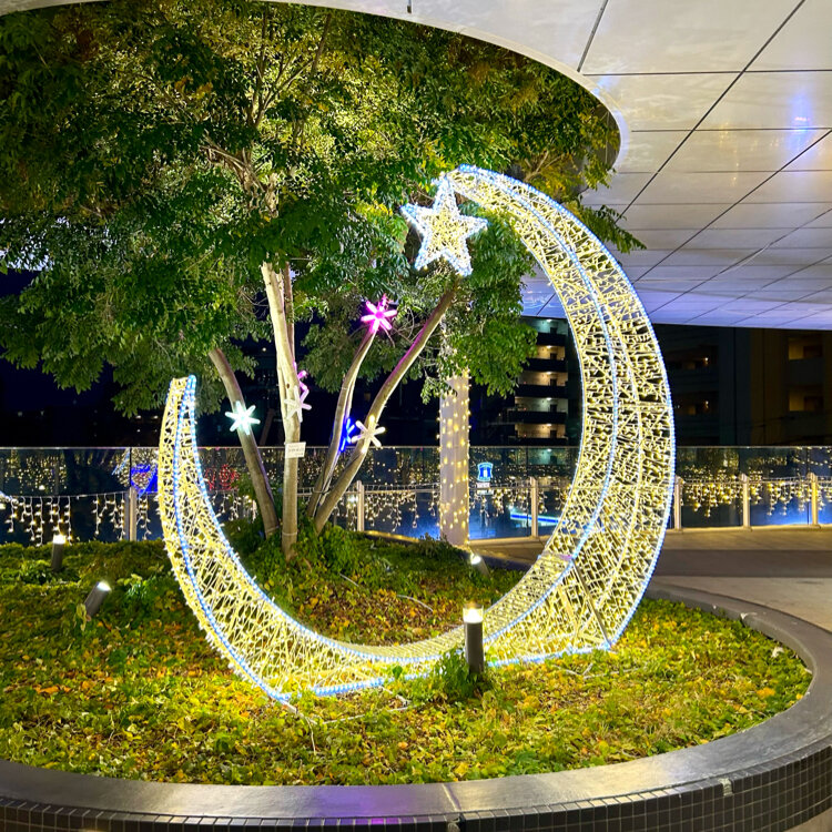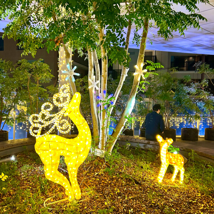 広場の真ん中には光輝く円錐形のツリー、お星様やお月様のモニュメント、可愛らしい動物さんもいました。