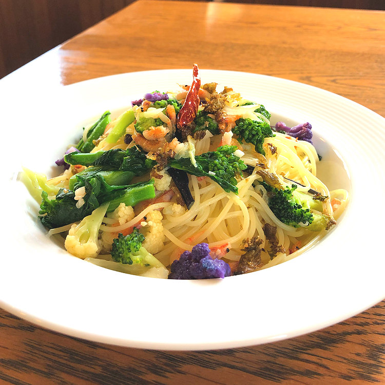 おすすめメニューの中から 選んだのは、花野菜と桜エビのパスタ。