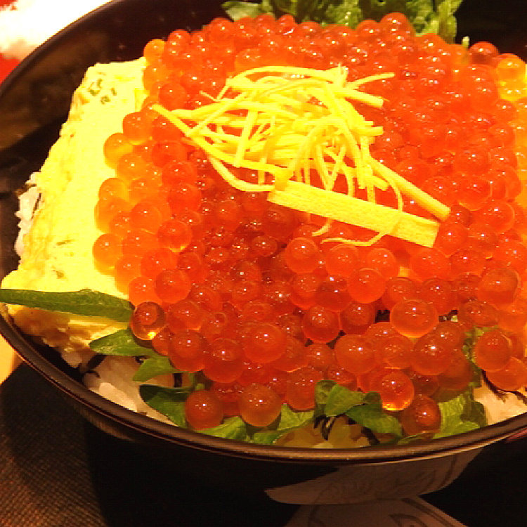 私が食べた鮭はらこ丼。たっぷりのはらこの下に、塩引き鮭も隠れています。氷頭なますの小鉢もついて、お腹いっぱい。柔らかなはらこに大満足! #割烹 #ランチ #海鮮 #村上