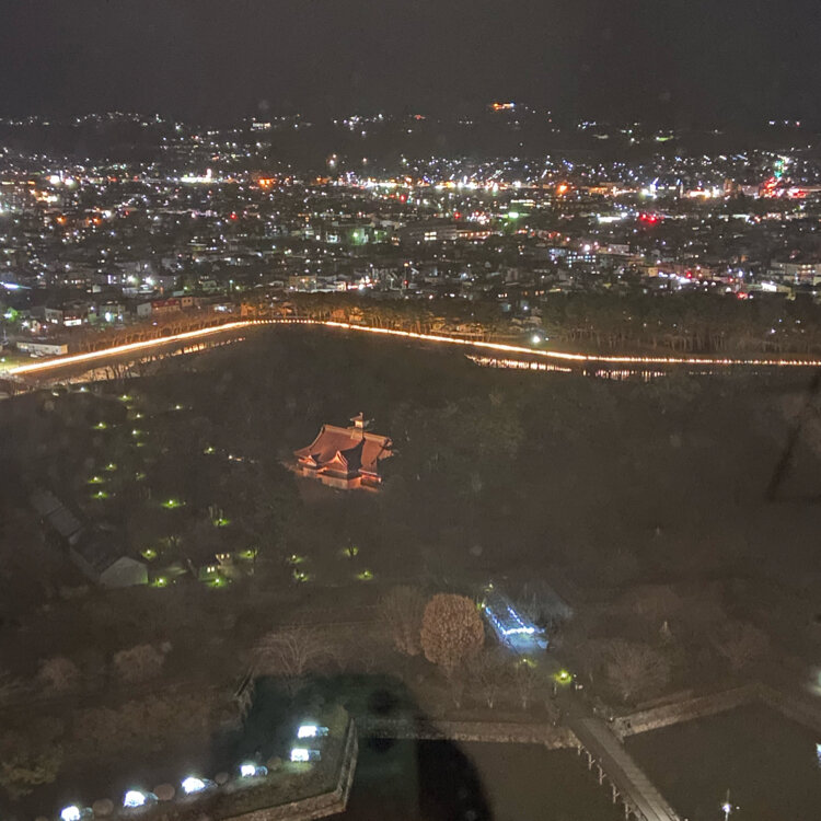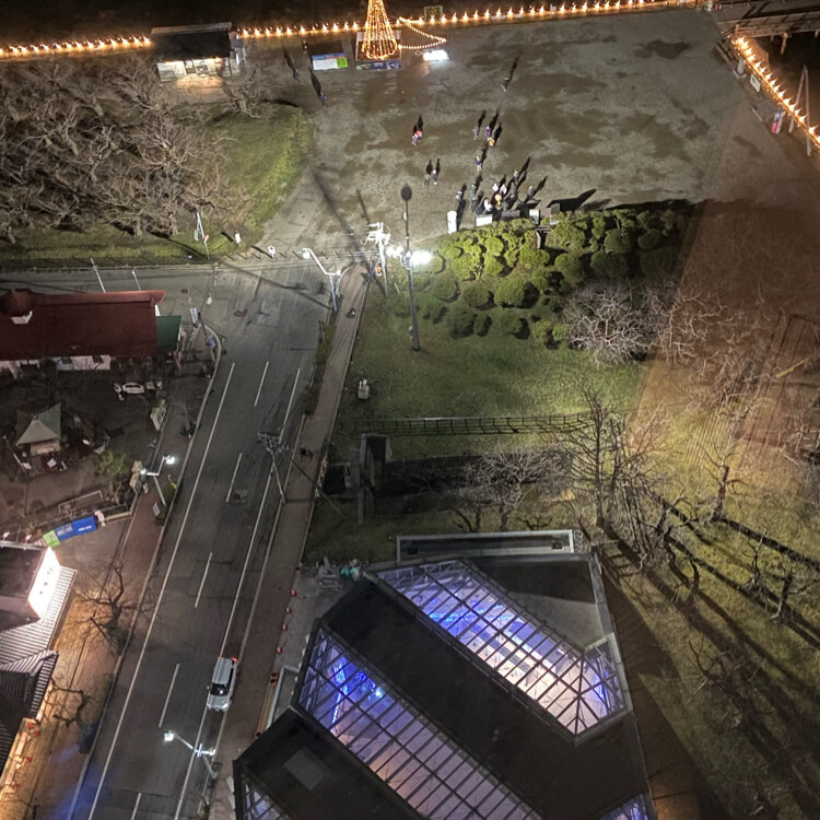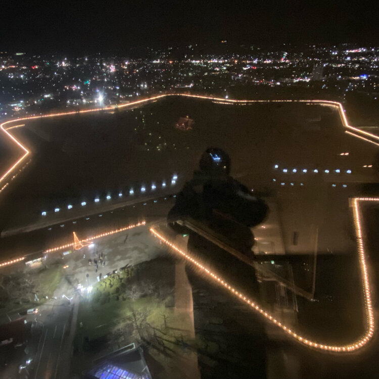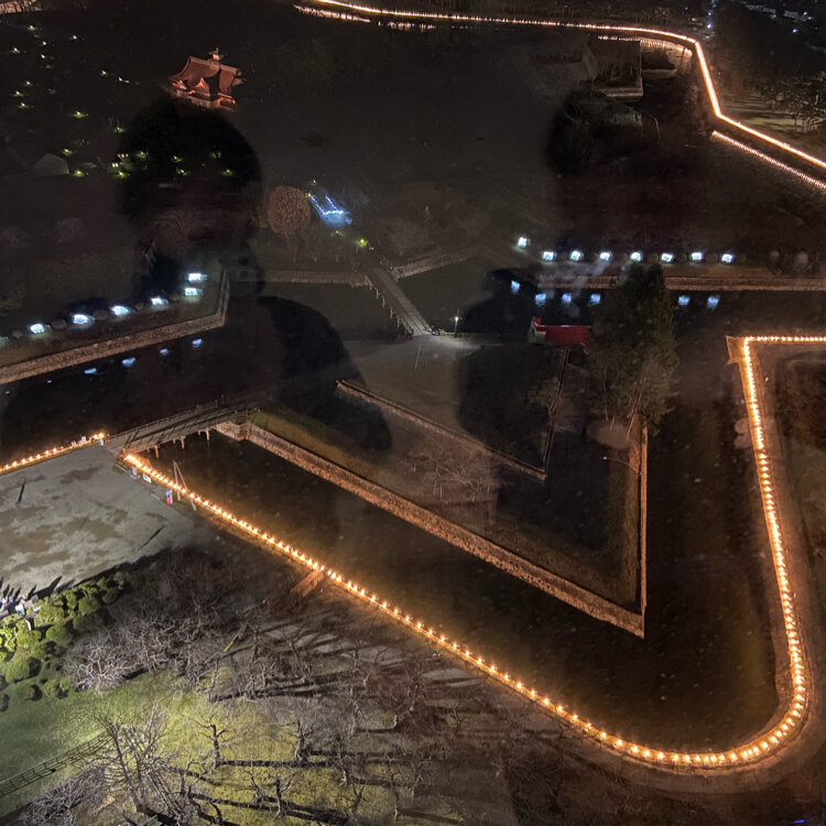 五稜郭タワー☆五稜星の夢イルミネーション🎄 堀が約2000個の電球で彩られ、 美しい星形が浮かび上がるイルミネーション✨ 雪が積もると、反射して また綺麗に 見えるようで、 今年は まだ雪が少ないの で、このような感じです♪♪ 真ん中のオレンジ色に ライトアップされているのは 復元された函館奉行所です🙌 #開運旅 #ことりっぷと一緒