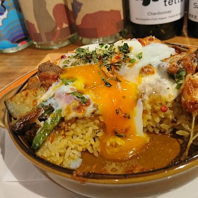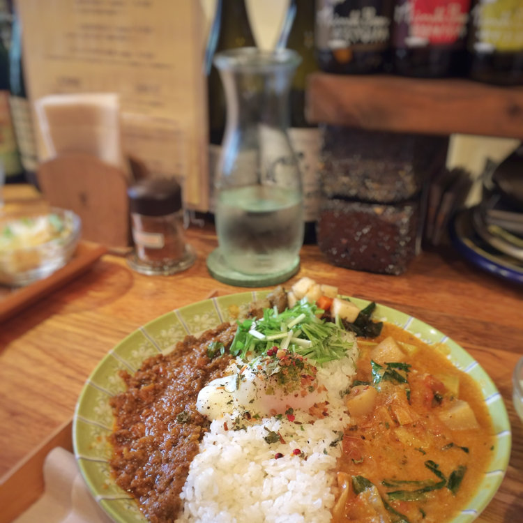 私がいただいたのは、看板カレーのキーマカレーと日替わりの気まぐれカレーが一緒に味わえる「あいがけ」カレー。上には温玉も載っています♫二種類のカレーは全く違った味で、どちらもそれぞれにスパイスが良い具合に効いてて美味しかったです😄ちょい呑みもできるようにと、お酒も置いてありました!