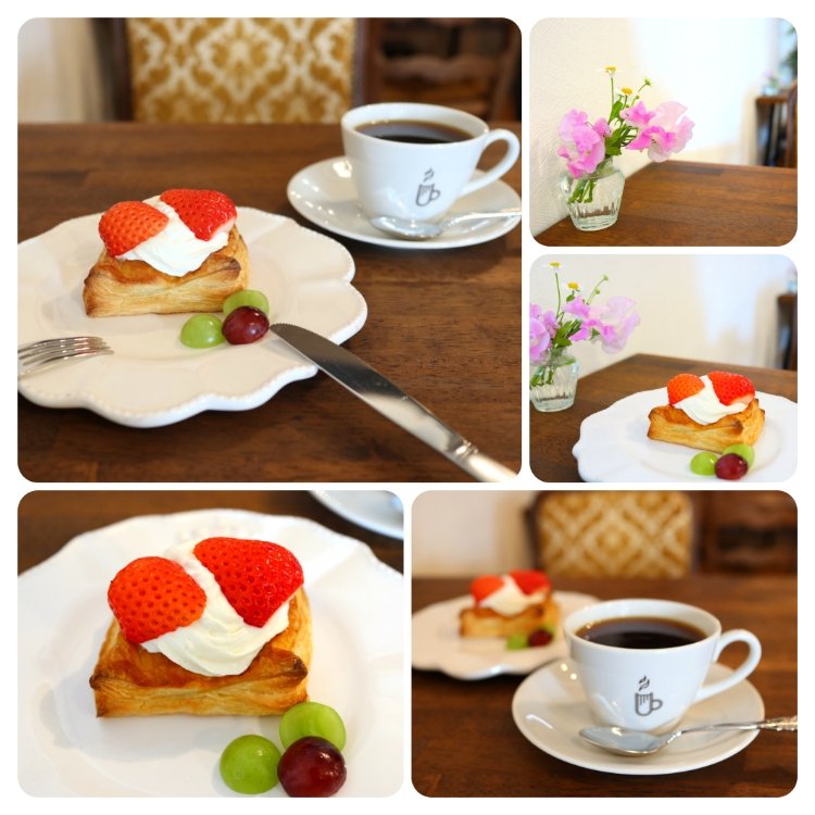 Cafe Classmateさんへ。 アップルパイとブレンドコーヒーを。 デニッシュ生地のアップルパイ。 クリームと苺もトッピング。 春らしい可愛いスイーツ。