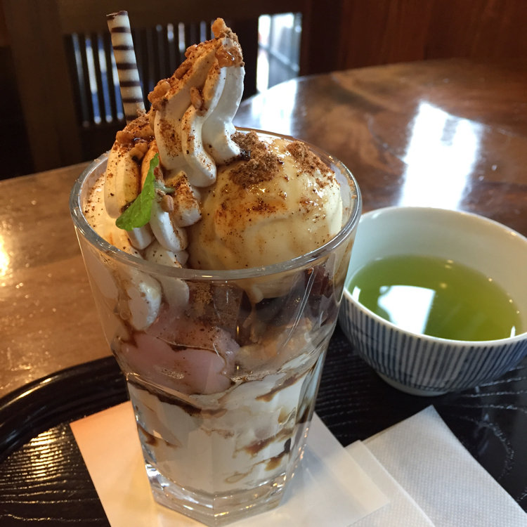 ちょっといっぷく🍵 *黒蜜きなこパフェ かき氷で有名な和菓子屋さんの秀月堂さんに来ました。かき氷と迷いましたが、今日はちょっと肌寒かったのでパフェに 笑 パフェの中には生クリーム、アイス、コーンフレークの他にあんこや寒天、お花の形をした白玉などが入っていて、黒蜜と相まってあんみつを食べているみたいでした❤️ 特に白玉はモッチモチでしたよ‼︎