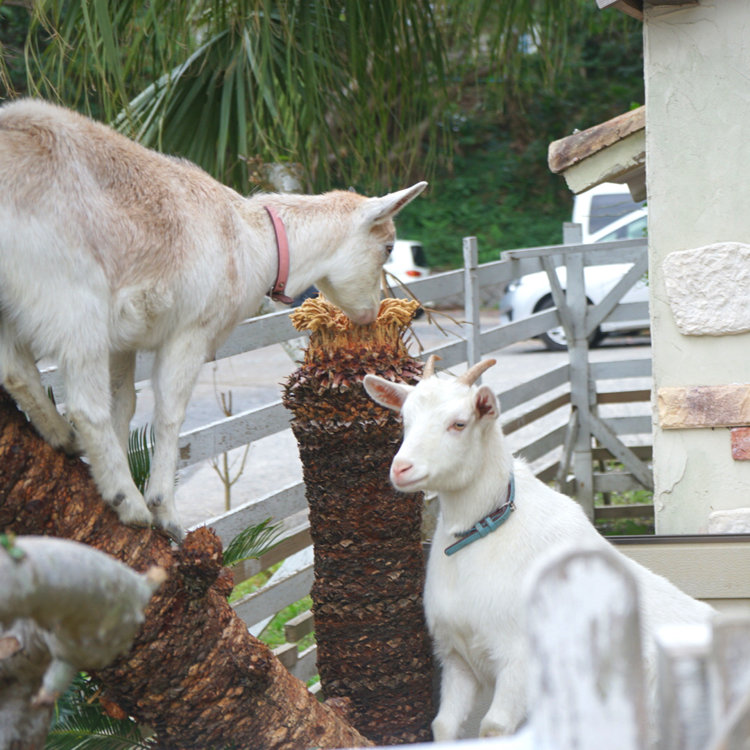 ホテルの駐車スペースの一角に立派なヤギ小屋があり、そこで2匹仲良く暮らしています。ホテルのスタッフがリードをつけてお散歩していたり、とてもほのぼのした雰囲気です。
