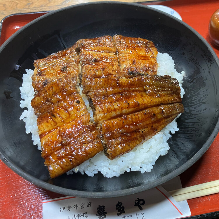 伊勢 喜多やさん🐟 うなぎです☺️ 、 ずっと行きたかった店😊 、 伊勢のうなぎと言えばここです😊 、 背開きが伊勢には多いらしいですがこちらはちょっと蒸し(蒸らし)が入ってます♨️ 、 さらに焼き方は箸で焼いているのだ🥢🧑‍🍳♪ 、 関東竹串、関西鉄串の両方にあらず完全伊勢オリジナルうなぎです☺️ 、 これはですね 伊勢には孝行鰻と言うのがありましてですね むかしむかし父親が病気になり😷親孝行の息子が薬を探し回り飲ませてみるけど一向に回復しない😷 ある日江戸の人からうなぎが身体にいいと聞いてうなぎを獲って父親に食べさせると めちゃくちゃ美味しい😂元気になりそうだ と言われたので毎日うなぎ焼いてた😊 、 でも仕事しながらうなぎを獲って食べさせるのは大変だったから、いっそたくさん獲って蒲焼きを売ろう😲一念発起 、 やがて味も孝行話も評判になり役所からもご褒美をいただいた😊🎁という実話です💁‍♂️ 、 彼の気持ちを汲んでこの時の焼き方を100年守り続けているのが喜多やさんなのです🏠✨ 、 さて、わたしの順番が回って来ました🙂 、 なんと大人女子と相席です😳 これは気まずい😂 、 すぐに空気モードに入ります🫥 、 フラグシップモデルは伊勢まぶし😊 、 タレが沁みたご飯に蒲焼きが乗ってます😊 タレ沁みごはんって伊勢モデルだったんだ🙂 、 わたしは初めてでタレの味がわからなかったので別でタレが付いてくるうな丼にしました😊 、 来ました🥹 、 ビジュアル最高やん🥹 、 白と茶色のコントラストがくっきり☺️ 、 うなぎは王道の一色産🐟 白焼を100年門外不出の白焼蒸らし箱を使い自然蒸し状態を注文が入ってから焼きます😊 、 ではいただきましょう🙏😊 、 うますぎる😂 、 蒸しのふわふわがすごい😂 、 醤油も溜まりですね😊伊勢式です 、 これは伊勢まぶしにしといたらよかった🙂と思いつつ付属のタレをどばー 、 美味しい😋 、 これは並びますわ、外宮の真ん前なのでお越しの際は是非食べてください😊おすすめです 、 、 #あきらの東海 、 #あきらの鰻