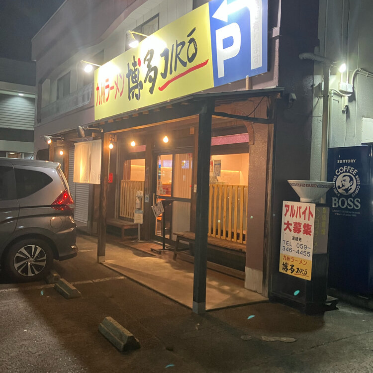 四日市 博多JIROさん🍜 気になっていたラーメン屋さんに行きました☺️ 、 豚骨ラーメンです😊 、 三重県って豚骨ラーメンあんまりないんですよね🙂 、 美味しい店は並ぶしなかなかたべれないんです🍜 、 さて、遅い目の時間帯だったからすぐ入れました😊 、 豚骨ラーメンの麺固めにします🙋‍♂️ 、 来ました🥹 、 流石博多を冠名にしてるだけありいいビジュアルです☺️ 、 いただきます🙏😊 、 あ❗️🙂美味しい😋 、 臭みは皆無で油は少なめで味はしっかり☺️ 、 万人受け豚骨のお手本みたいな感じです😊 、 あっさりなのか濃厚なのかわからないサラサラだけど味はしっかりな感じ?😊 、 予定してなかった替え玉もお願いしてお腹いっぱいになりました☺️ 、 ごちそうさまでした😋 、 #あきらの東海 、 #あきらの麺類