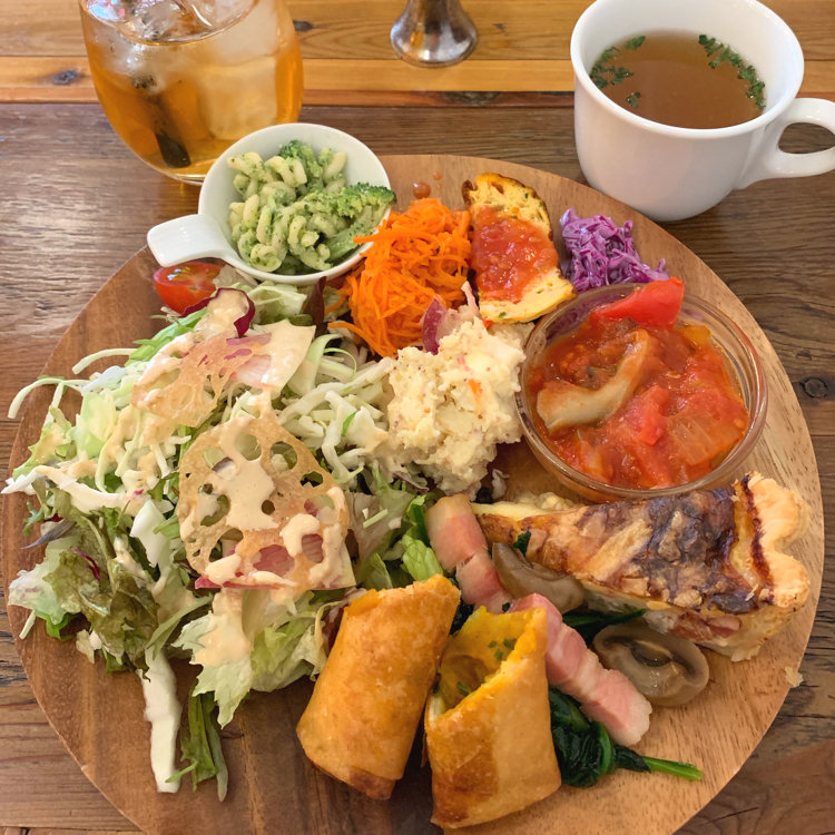 サラダ、お惣菜(フリッタータ、キャロットラペ、ほうれん草とベーコンのソテー、鶏肉の煮込み、キッシュ...)、スープ、ドリンク、ミニデザート