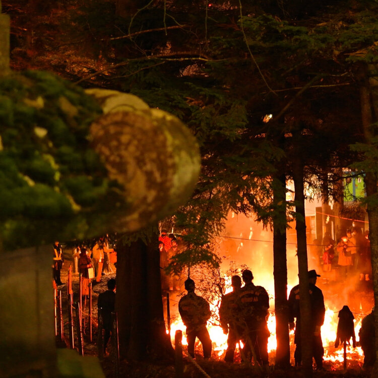 燃え盛る🔥炎と夜空にたちのぼる煙