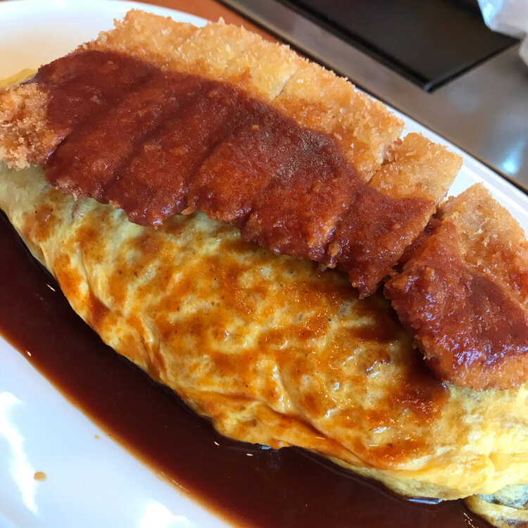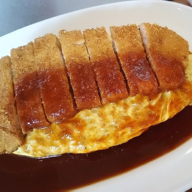 沢山出してるお店があってそれぞれ特徴があるらしいですが、オムライスの上にドーンとトンカツがのってる〜のは同じ。