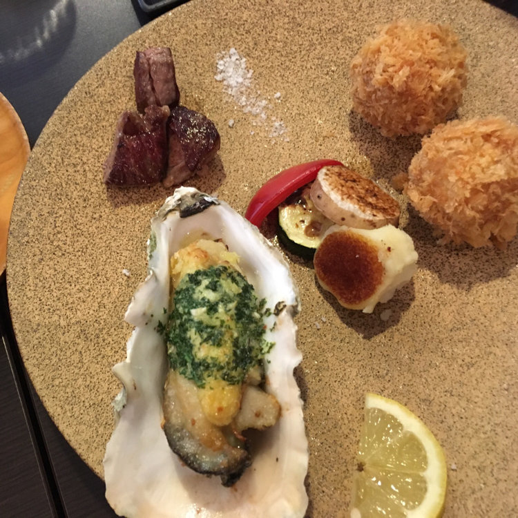 プレートランチ。 牡蠣のオーブン焼き。 牛肉コロッケ。 お肉。