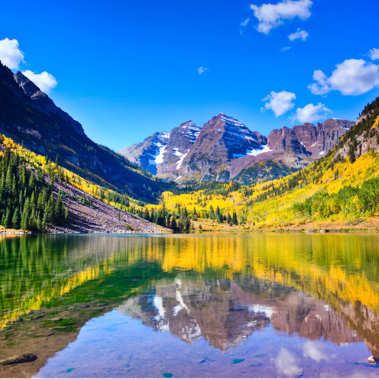 遺産詳細:マルーン湖とマルーンベルズの山はコロラドロッキーを代表する景色です。夏にはワイルドフラワーが美しく咲き乱れる姿を見る事ができます。