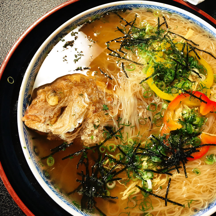 鯛そうめん 湊かなえさんのエッセイを読んで食べてみたかった「鯛そうめん」(ミーハー笑) 甘めのつゆに一味?が効いていて、鯛のお出汁が美味しい。そうめんは細めでつゆが絡んで、、♪