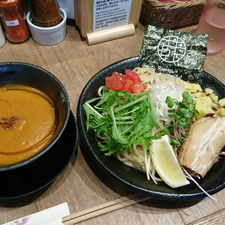 なんばCITYのなんばこめじるし内にある 「海老鶏麺蔵」の海老つけ麺🍜 海老の殻まで使ったスープ気になる…😒 え❗令和記念で500円😲 締めに無料の追い飯とミルク出汁も注文できるそうですo(^o^)o麺だけで充分お腹いっぱいで私は諦めました😂💦