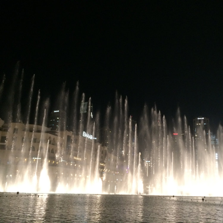 【UAE・ドバイ】 ドバイファウンテン。音楽に合わせて噴水が舞います。アラブ風の曲だったりポップな感じだったり。 30分毎約4分ですが、何度も見ちゃいました。