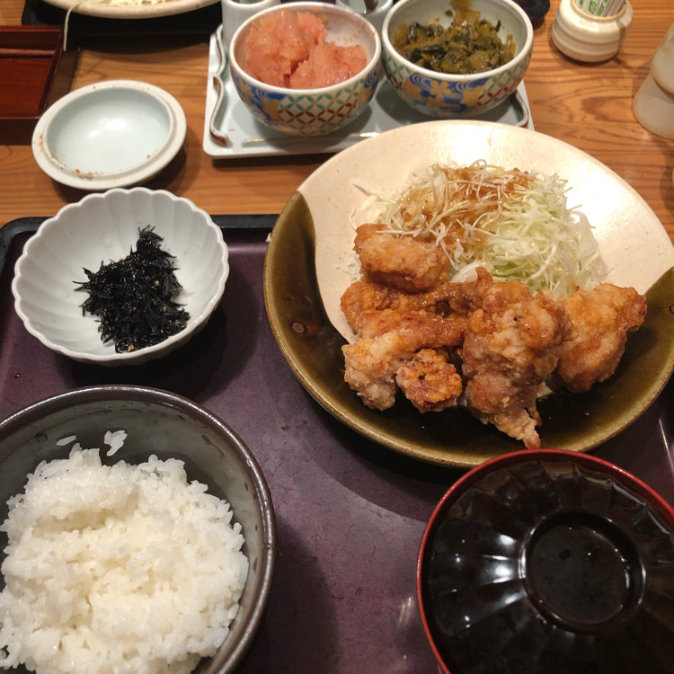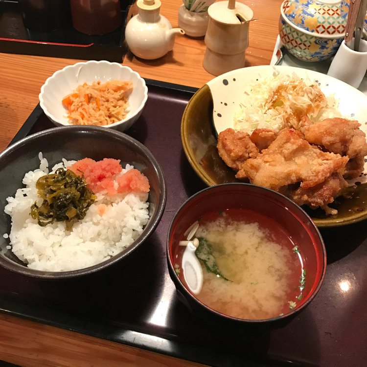 栄 博多もつ鍋「やまや」ランチ 鶏の唐揚げ明太風味定食 明太子、高菜、ご飯食べ放題!