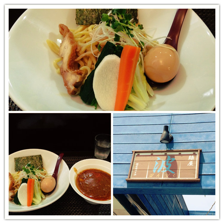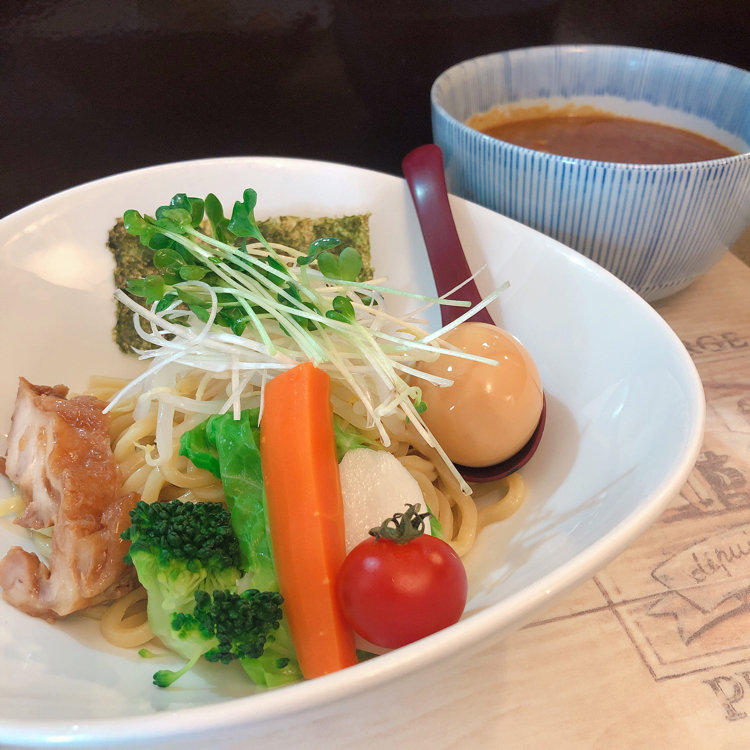 #鎌倉#カレーつけ麺#麺屋波 鎌倉野菜も彩り綺麗なとても美味しいつけ麺。スープにはこの写真では見えないけどホロホロに煮込まれた手羽元が入っています。麺を食べ終えたらご飯とお出汁を頂きカレー茶漬けに。食後に小さなアイスも出してくださいます。