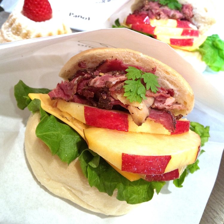 盛岡りんごとパストラミビーフをはさんだベーグルサンドです🍎🥯