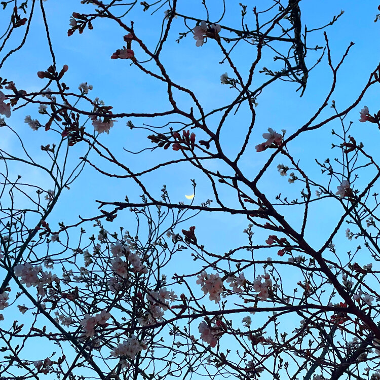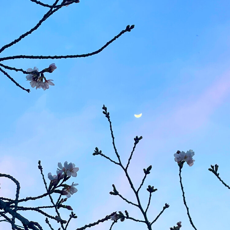 咲き始めたソメイヨシノと三日月🌸🌙 去年は見ることができなかった景色。