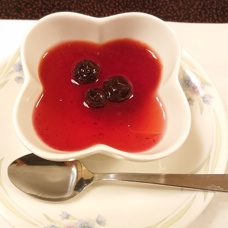 #箱根 ホテル花月園の夕食例6 カシス&ブルーベリーゼリー。後、構図的に使えないので写真は上げませんが、ご飯と白味噌のお味噌汁もありました。