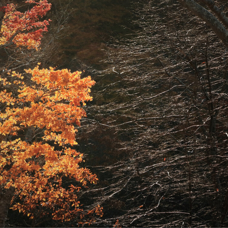 奥で黄色の点滅信号がチカチカしていて、林がオレンジ色に写ってます。。。