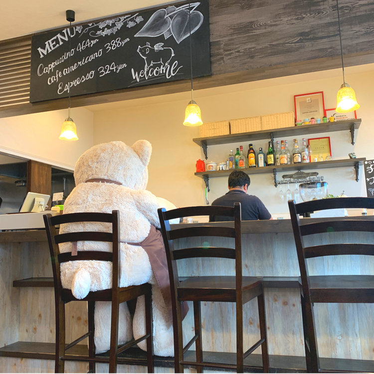 水色のドアを開けばまず目に入るのが、カウンターでまったりしているクマさん。