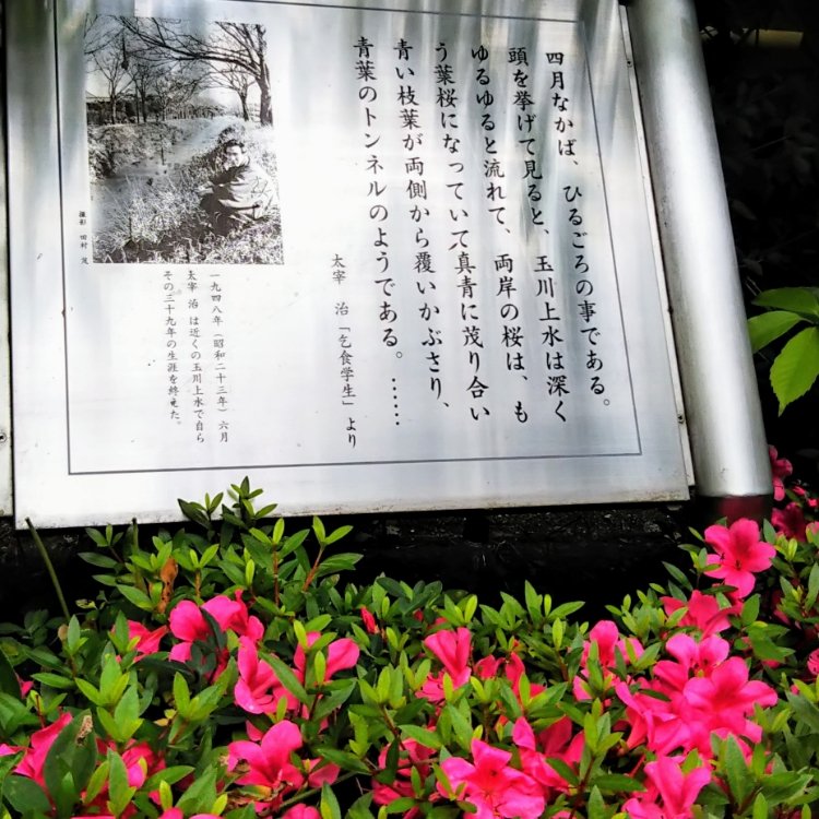 このレリーフには玉川上水の堤に腰をおろす太宰の写真がありました。