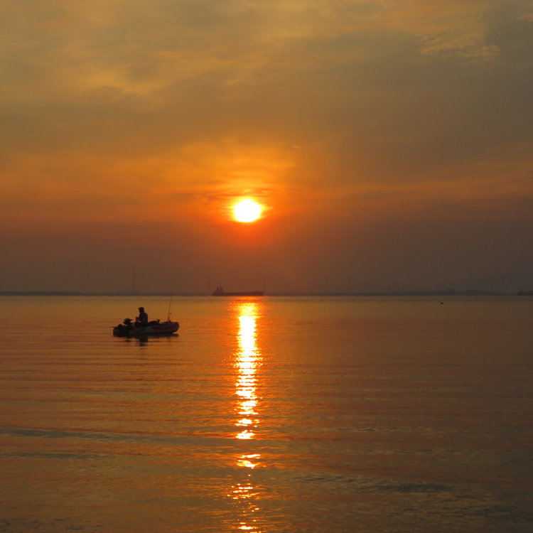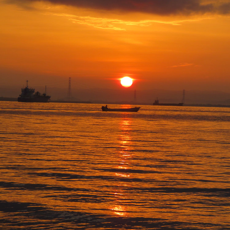 おはようございます(^^) 朝日のラインに船が…って、よく見たら太陽さんが茶碗蒸しの器みたいな(笑)
