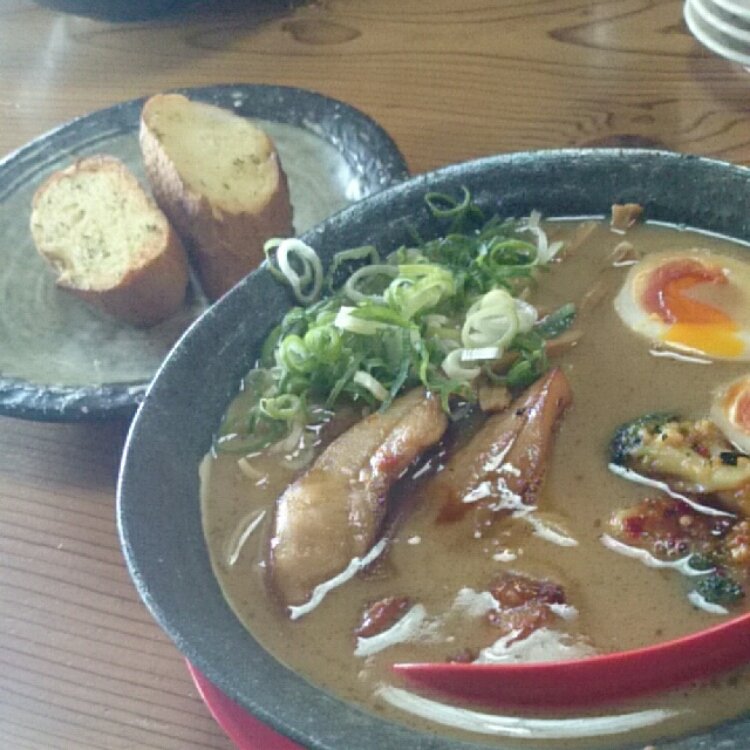 こってりこがしにんにく麺 ガーリックトーストはスープに浸して頂きます(*^^*) めっちゃ合う!