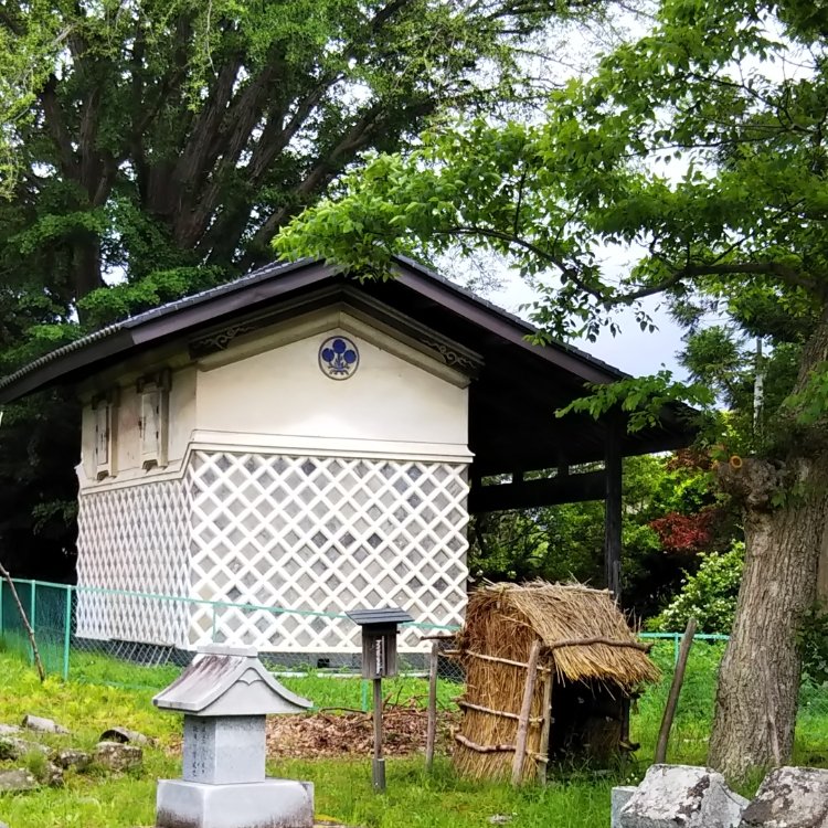 唯一、土蔵がオシャレ。諏方家の梶の木の家紋がオシャレ。土蔵の後ろにあるのは諏訪市天然記念物、推定樹齢200年のイチョウ。掘っ立て小屋のようだけど、秋葉さまを祀っている祠。ここにも小さな御柱が立っている。