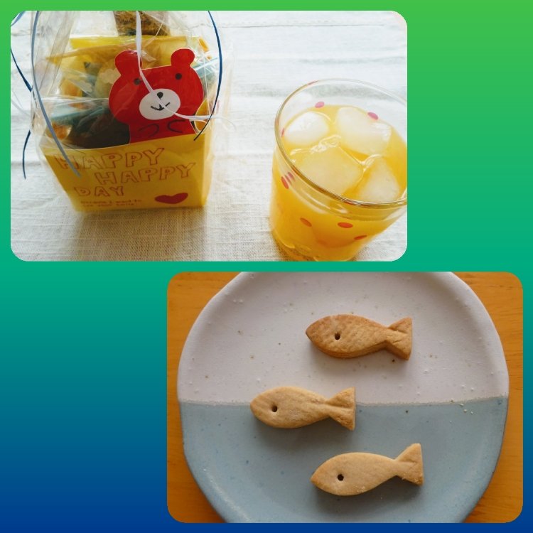 今日のおやつは、奄美大島をご一緒したステキユーザーさんからのいただき物🎁 可愛いくまさんボックスに入っているのは、福岡県古賀市の“ オーブンベーカリー 風の小屋”さんの焼き菓子セット🎵 その中から、可愛い全粒粉入りおさかなクッキーを、別のユーザーさんの投稿をパクって撮影してみました😜 ドリンクは、奄美の「まるごとたんかん」ジュース🥤