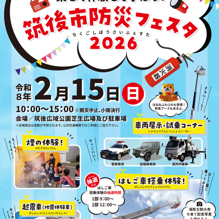 * 小さい頃から、楽しみながら防災について学べると良いですよね✨️ 来月2月15日(日)は、『楽しく体験して学ぼう!筑後市防災フェスタ2026』🚒 またまた、主催の筑後市消防本部さんより、イベントPR動画が届きましたのでご紹介✨️ 🚒はしご車搭乗体験(抽選時間が1部:9時〜、2部:12時〜) 🚓パトカー、自衛隊などの車両展示コーナー 🚑ゆらゆらぐらぐら!起震車(地震体験) 🚒消防士さんの防火衣を着て記念写真 📕としょまーる号で図書館員体験 筑後市PRキャラクターはね丸が登場&大人気はね丸ふわふわ遊具、飲食ブースも❣️ * 日時 令和8年2月15日(日)10時〜15時 会場 筑後広域公園芝生広場及び駐車場 雨天中止、小雨決行 #恋のくに筑後市インスタっ隊 #筑後市防災フェスタ #はしご車搭乗体験 #親子イベント福岡 #はね丸