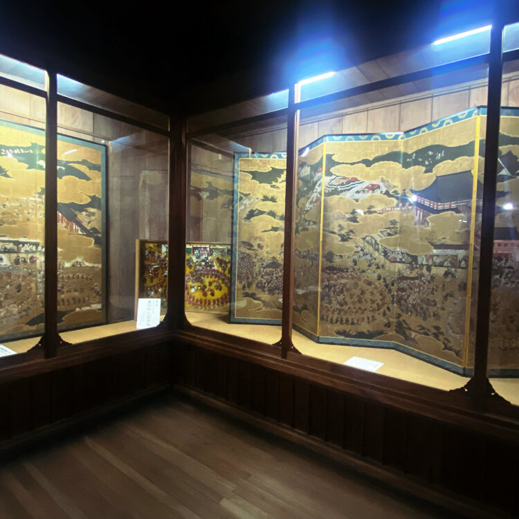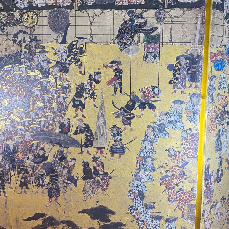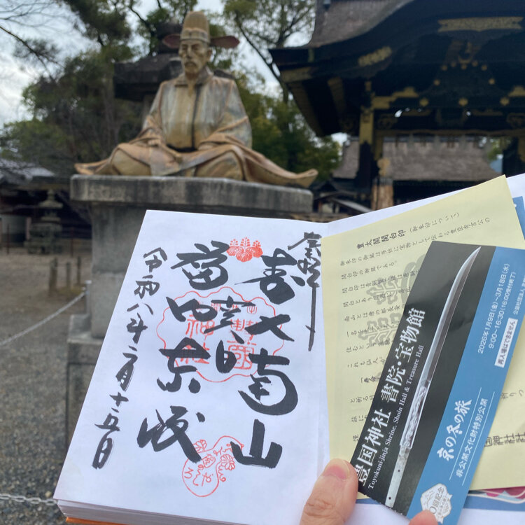 京の冬の旅 豊国神社 書院・宝物館🚶 大河ドラマゆかりのところですが、ここまで登り詰めるのは、 先の話ですが、一足先に豊臣家が全盛を極めた宝物を 見に行きました。 宝物館・書院も全て撮影は可能で、 大正時代に建てられた宝物館の展示ガラスは当時のガラスで、 床は歩くたびギシギシと音を立てますが😅、 少し薄暗い宝物館は趣きがあります。 「豊国祭礼図屏風」には、いろんな格好をしている人々が 描かれた、タケノコ着ぐるみの人もいます😆なぜっ?? 御朱印は、秀吉像と一緒に撮りました📷 #開運旅 #京の冬の旅 #非公開文化財特別公開 #豊臣秀吉 #大河ドラマ