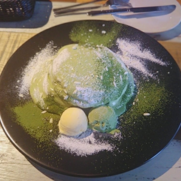 ハワイアン風のお店 季節によってパンケーキのメニューが変わります!ちょっとお高めの値段ですが頼んで損は絶対しません! 今回は抹茶のティラミス風パンケーキを頼みました。抹茶の好きにはたまらないですね。パンケーキは三枚重ねになっていてボリュームが結構あります😋