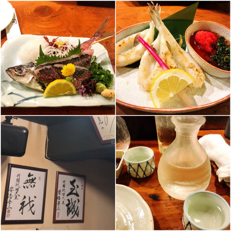 月曜にもかかわらず大盛況!左上から時計回りにアジのお刺身,フグ一夜干し,山口の地酒「雁木」,安倍晋三首相のサイン!です。