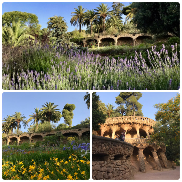 グエル公園 ゆっくり見ていたら1時間以上かかってしまいました。 一部は改修中でしたが、 坂の上の傾斜地なのでバルセロナの街も見晴らせ 庭園にはお花もたくさん咲いてきれいでした。 正面入り口右手の守衛室?お菓子の家も可愛らしくて素敵でした。