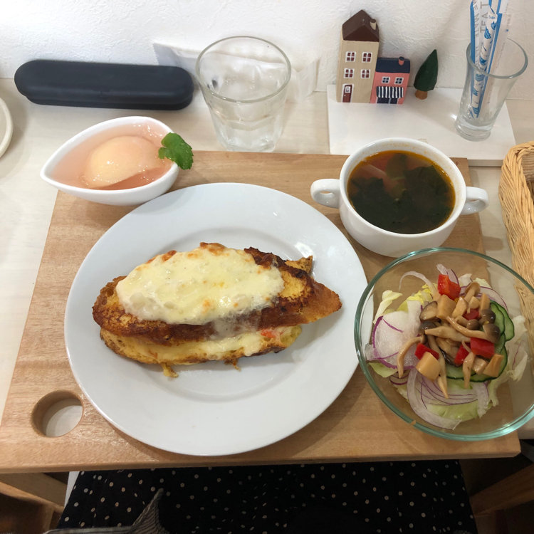 7月の土曜日オンリーのモーニング🥐¥600 今日はツナとエビのクロックムッシュ ドリンク場ホットレモンティー🍋