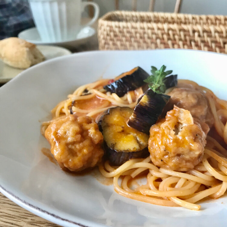 「なずな食堂」 本日の生パスタ "なすとミートボールのトマトソース" 使用しているのは淡路麺業の生パスタ 手作りミートボールが大きくてふわふわ♪あっさり味のトマトソースと良く合います サラダとパン付き パンもモチモチふわふわ🎶 #なずな食堂 #小野市 #ランチ #生パスタ #食堂 #カフェ