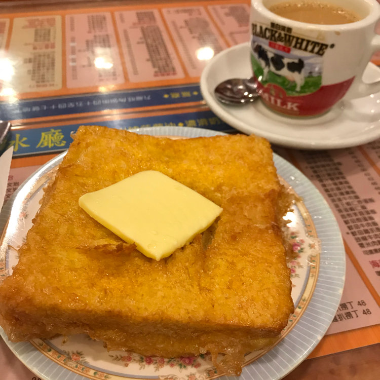 香港、茶餐廳名物、法蘭西多士、いわゆるフレンチトーストをオーダー。卵液を付けて焼いたパンというより、トースト(二層)をたっぷりの油でバリッバリに揚げ、ざっくり大胆カットのバターをトッピング、そこにメープルシロップをかけて頂く、油脂ON油脂WITH糖蜜といった罪悪感の塊のような一品。一般的なフレンチトーストを期待してオーダーすると、コレジャナイ感満載。しかし中華風揚げトースト、シロップ漬けを頂いているとおもえば、全然有り。高火力で調理されている感じで、香ばしさに中華の職人のプライドを感じる。これを食べると、香港にいる、という気分になる。