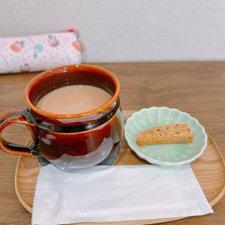 キャラメルティーラテときな粉と胡麻のビスコッティ🫖✨甘いキャラメルと甘さ控えめのビスコッティがいい感じでした🎀 ゆったりした時間を過ごさせてくれる所でした☺️