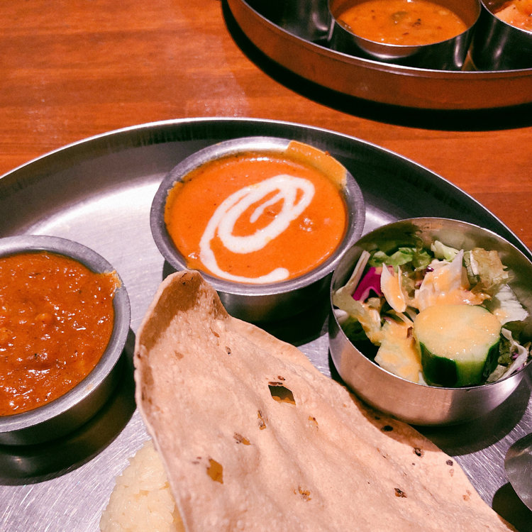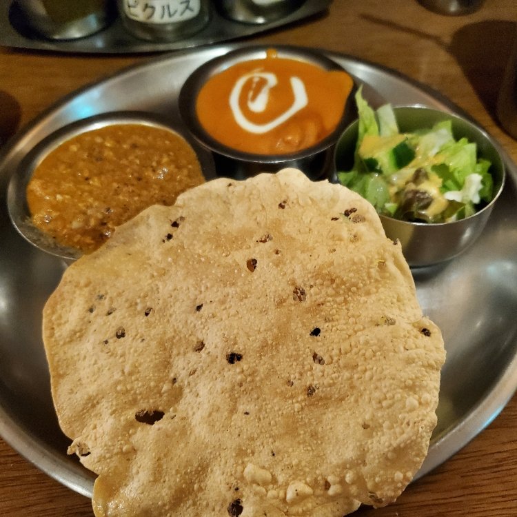 開店前に伺って既に何人かと列になっていたら開店、一巡目で着席出来ました♪好きなカレー二種類とサラダ、ライスにパパドというパリパリのおせんべい的なものがついてきます。カレー好き辛いの苦手なので、バターチキンと野菜のカレーにしたかな?どちらも辛味より旨味が勝り、食べやすくて最高でした…♡パパドを砕いてライスとカレー二種類と混ぜて食べてもまた旨し(≧∇≦)