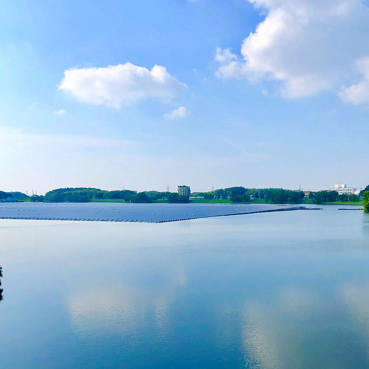 向う岸の 湖面に浮かんでいるように見えるのは、ソーラーパネル。